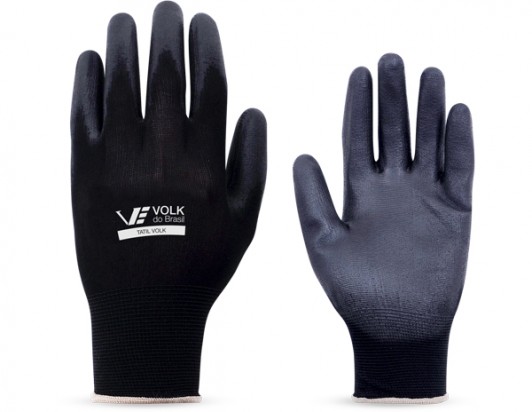 Luva de segurança confeccionada em fibras sintéticas, revestimento da face palmar e ponta dos dedos em poliuretano (PU), punho com inserções de fibras elásticas e acabamento em fibras sintéticas.